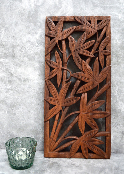 This panel features delicate bamboo plants hand-carved into a rectangular frame. It is stained a dark walnut colour.