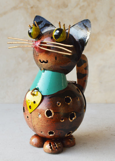 Decorate your home or garden with this metal cat ornament, which is also a tea light holder! It fits a standard tea light (not included). It was hand-painted in Bali with a beautiful, rustic finish. Can be used indoors or outdoors.