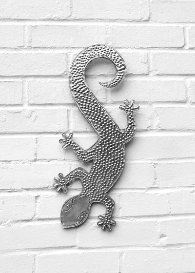 This is a hand-embossed, aluminium lizard decoration on a wooden backing, which includes a small loop for wall mounting. Can be used indoors and outdoors.