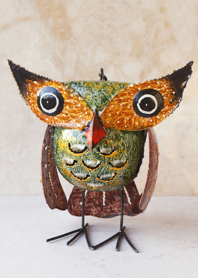 Decorate your home or garden with this metal owl ornament, which is also a tea light holder! It is hand-painted and fits a standard tea light (not included). It can stand on its feet or hang indoors or outdoors with the attached hook. Both wings lift up to reveal the place for the tea light.