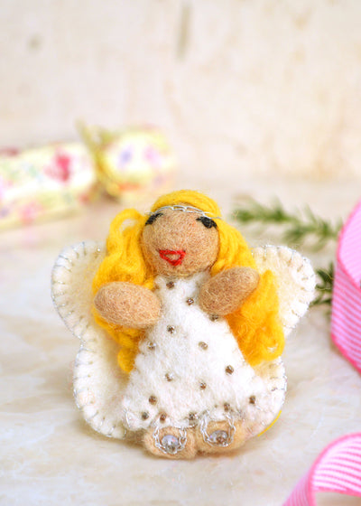This pretty angel brooch is perfect for adding some magic to your outfit and/or accessories! She has a hand-stitched smiling face, golden wavy hair with a silver halo.  Her white dress is embellished with tiny beads and her wings are edged with silver blanket stitch.
